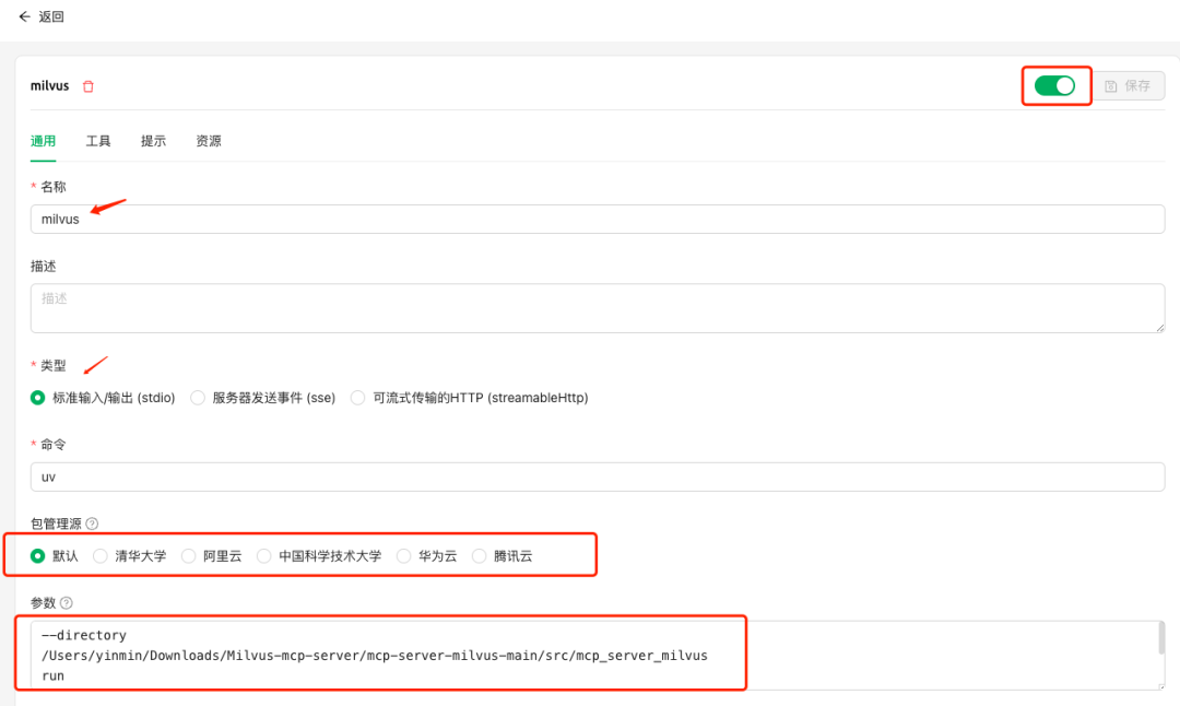 说明:包管理员可根据自身网络环境自行选择,保存后稍等几分钟即可完成MCP服务器添加。