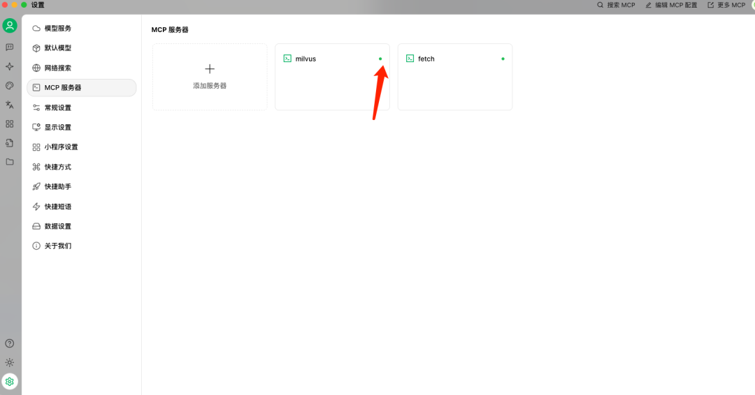 说明:添加milvus-mcp-server支持两种方式,分别是图形化界面及json配置文件。