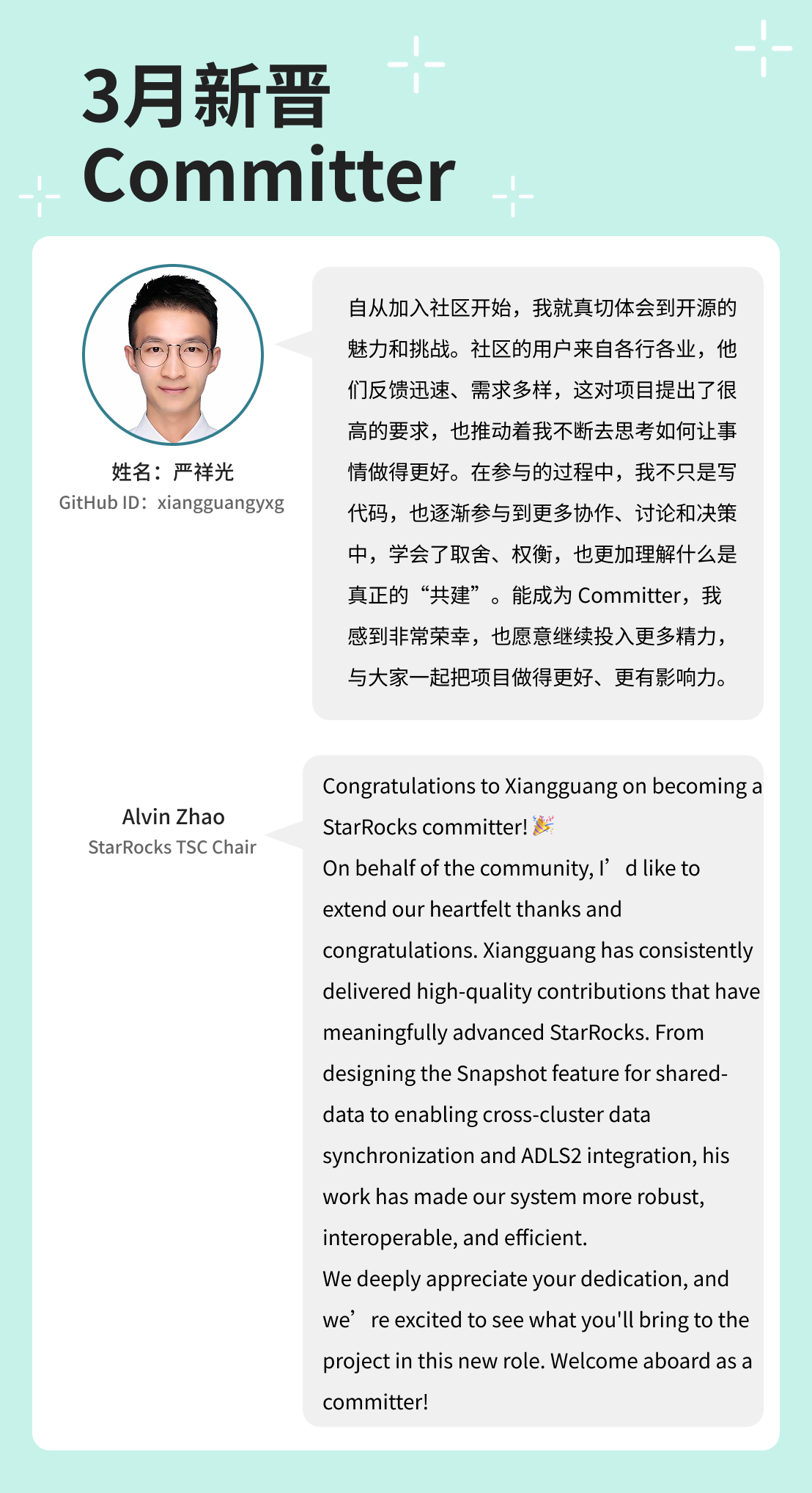 感谢新朋友们为 StarRocks 社区注入活力!期待你们继续闪耀光芒,与社区共同成长,创造更多精彩!✨🚀