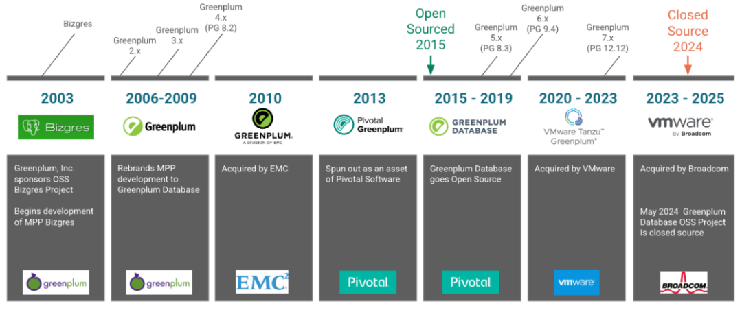 2020 年,VMware 收购了 Pivotal,包括 Greenplum,在保持开源的同时,维持了强大的社区参与度。然而,2023 年 Broadcom 收购 VMware 后,宣布计划将 Greenplum 转变为闭源模式,形势发生了巨大变化。
