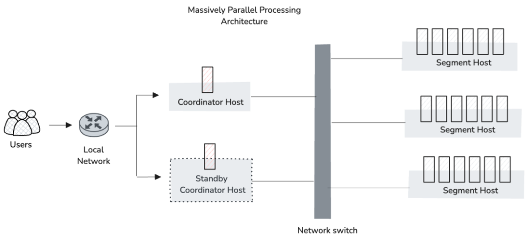 图 2:WarehousePG/Greenplum 的 MPP 架构由一个主要的协调主机和一组段主机组成。