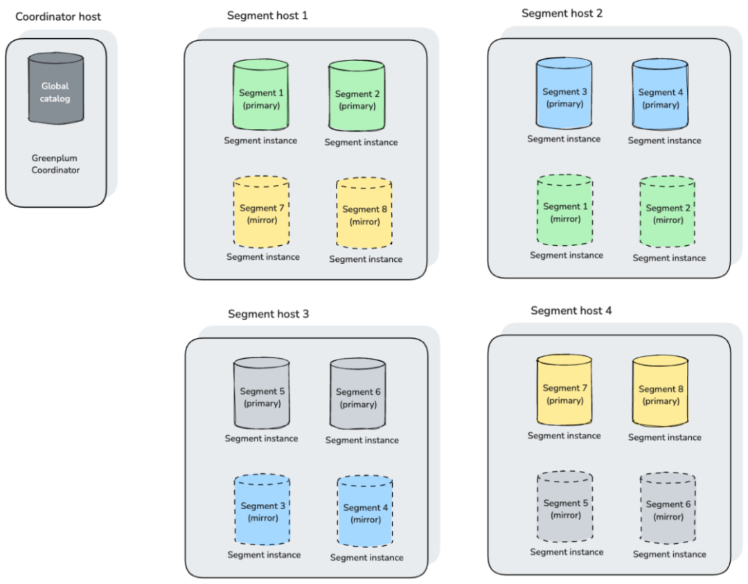 如果段主机出现故障怎么办?段镜像在段级别提供了关键的故障转移保护。每个主段可以有一个镜像段,镜像段维护其数据的精确副本。这些镜像被战略性地放置在与其主段不同的主机上,以实现冗余。如果主段不可用,系统会自动切换到其镜像,确保数据库操作不间断。Greenplum 提供两种镜像配置:组镜像(所有镜像集中在单个备份主机上)和分散镜像(镜像分布在多个主机上,以增强容错能力)。