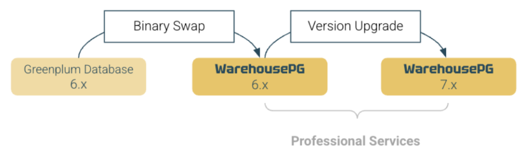 对于使用较旧版本的 Greenplum(如 6.x)的组织,EDB 专业服务还可以提供版本升级帮助——替换二进制文件,然后将其升级到 WarehousePG 7.x,以提高 Postgres 兼容性和高级功能,而不会中断业务连续性。