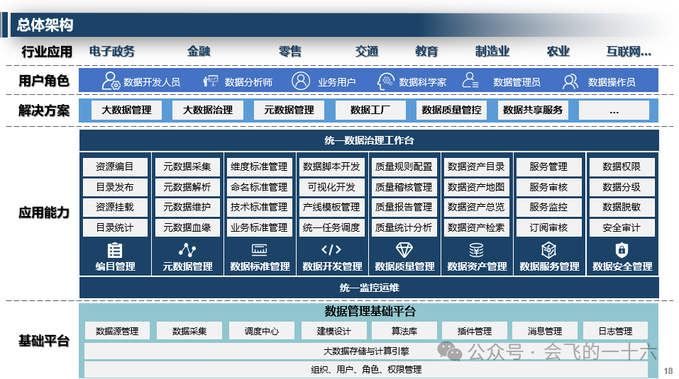 - 总体架构:包括行业应用、用户角色、解决方案、数据管理基础平台等。