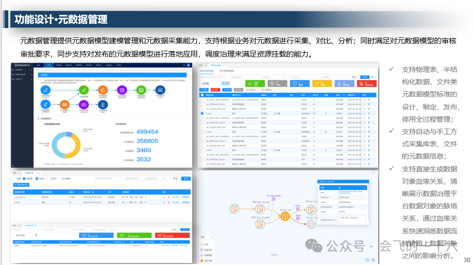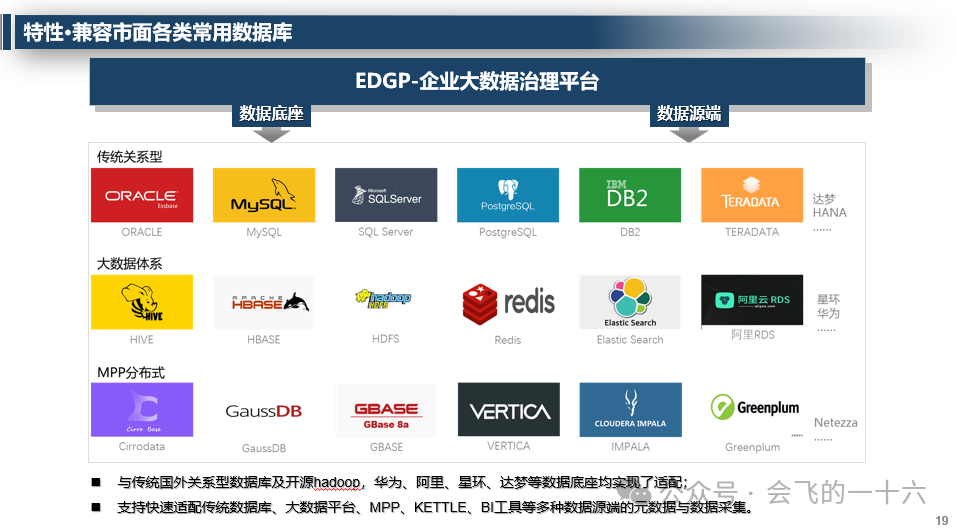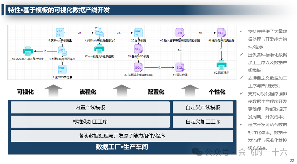- 特性:兼容各类数据库、前置元数据管理、多维数据标准管控、基于模板的可视化数据产线开发等。
