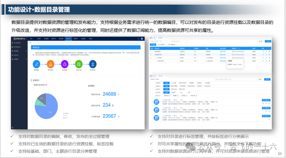 - 数据目录管理:提供数据资源管理和发布能力,支持数据编目、资源挂载等。