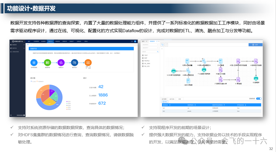 - 数据开发:支持数据源的查询探索,提供数据处理能力组件和标准化数据加工工序。
