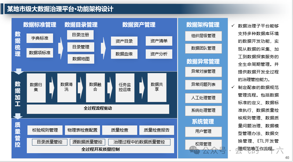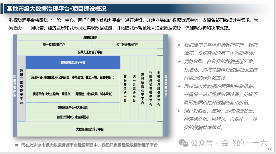 - 某地市级大数据治理平台:围绕“一舱一中心、两门户两体系九平台”进行建设,构建城市驾驶舱,实现数据赋能。