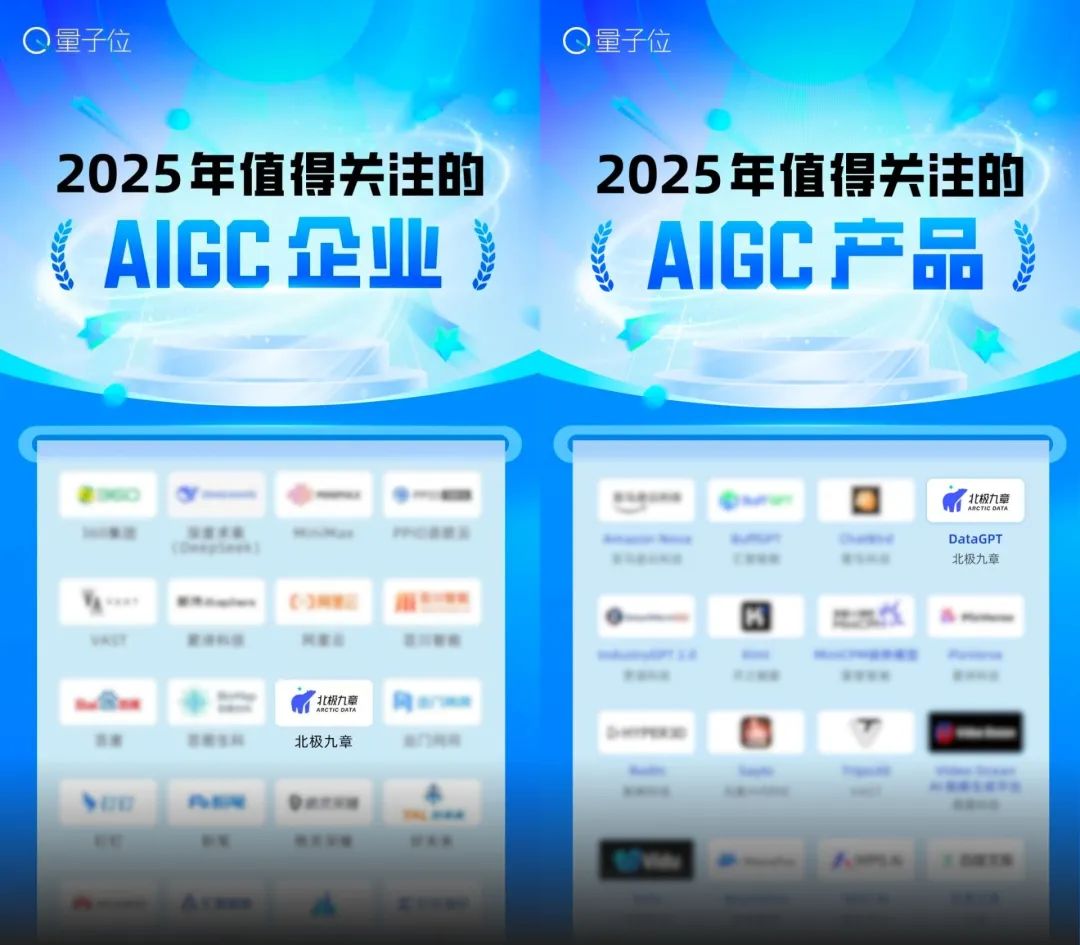 北极九章携旗下产品“企业级AI数据洞察引擎DataGPT”分别荣获“2025年值得关注的AIGC企业”和“2025年值得关注的AIGC产品”,获双项认可。