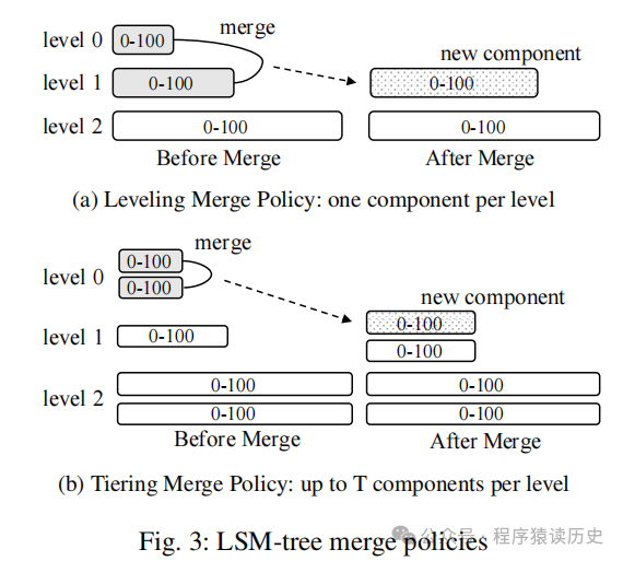 随着时间的推移,写入规模的增长,磁盘上会积累大量的SSTable文件,这些文件可能会覆盖相同的键。为了优化存储空间和查询性能,LSM-tree 会定期执行合并操作,将多个SSTable文件合并(Compaction)成更少、更大的SSTable文件。合并过程会删除过时的数据(如已被删除的键)并合并重复的键。这类合并主要由以下图Tiered Compaction和Leveled Compaction两种方式。