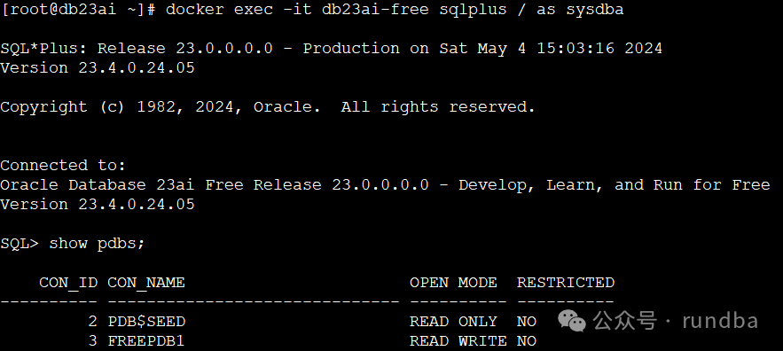 [root@db23ai ~]# docker exec -it db23ai-free sqlplus as sysdbaSQL*Plus: Release 23.0.0.0.0 - Production on Sat May 4 15:00:18 2024Version 23.4.0.24.05Copyright (c) 1982, 2024, Oracle. All rights reserved.Connected to:Oracle Database 23ai Free Release 23.0.0.0.0 - Develop, Learn, and Run for FreeVersion 23.4.0.24.05