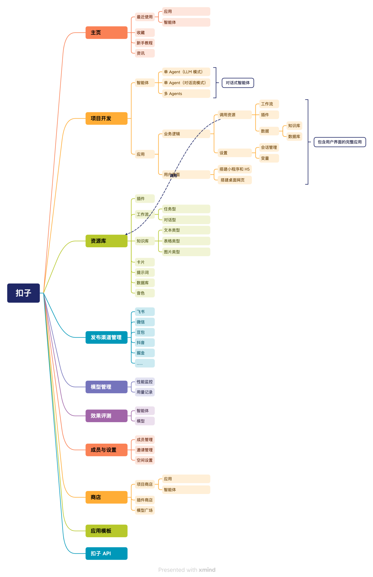 扣子是新一代 AI 应用开发平台,借助扣子提供的可视化设计与编排工具,可以通过零代码或低代码的方式,快速搭建出基于大模型的各类 AI 项目,满足个性化需求、实现商业价值,功能结构如下: