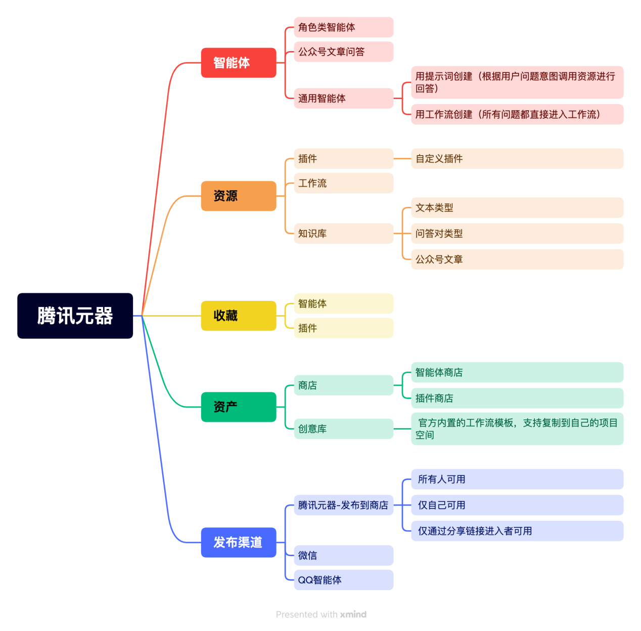 腾讯元器是基于腾讯混元大模型的一站式智能体制作平台,支持开发者运用插件、知识库、工作流等方式,低门槛打造高质量智能体,并发布到 QQ、微信等平台,也支持 API 调用 。功能结构如下: