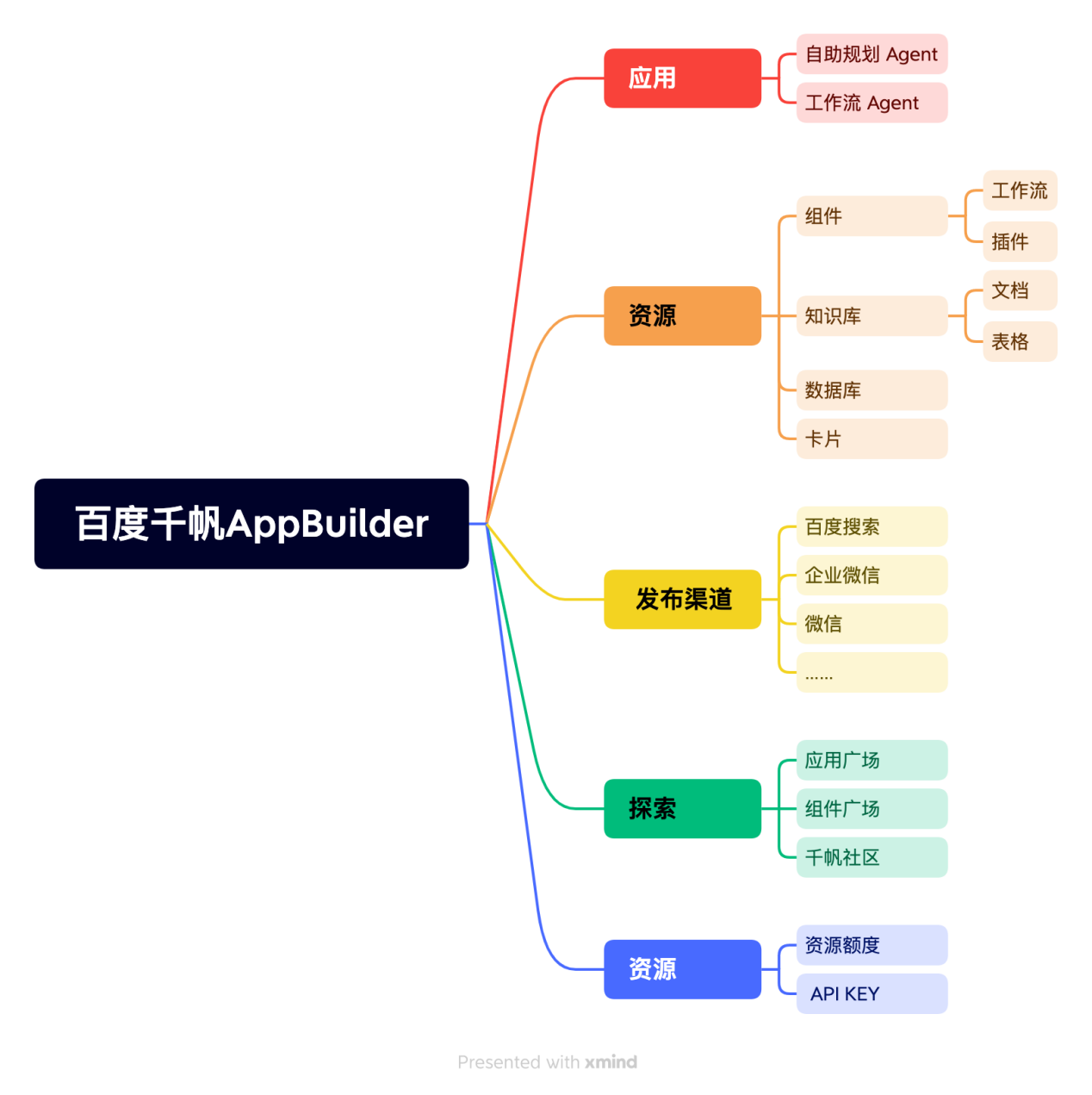 百度智能云千帆AppBuilder基于文心大模型搭建 AI 原生应用的工作台,提供 RAG、Agent 等应用框架与多模态能力组件,具备 大模型模式和工作流模式两种产品形态,降低开发门槛,满足企业敏捷开发需求 。功能结构如下: