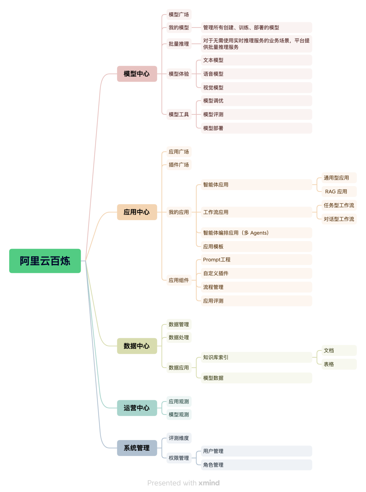 阿里云百炼大模型服务平台是一站式的大模型开发及应用构建平台,依托通义基础大模型,为企业提供专属大模型开发及应用整套工具链的平台,助力企业实现从模型开发到应用部署等一系列 AI 相关工作 。功能结构如下: