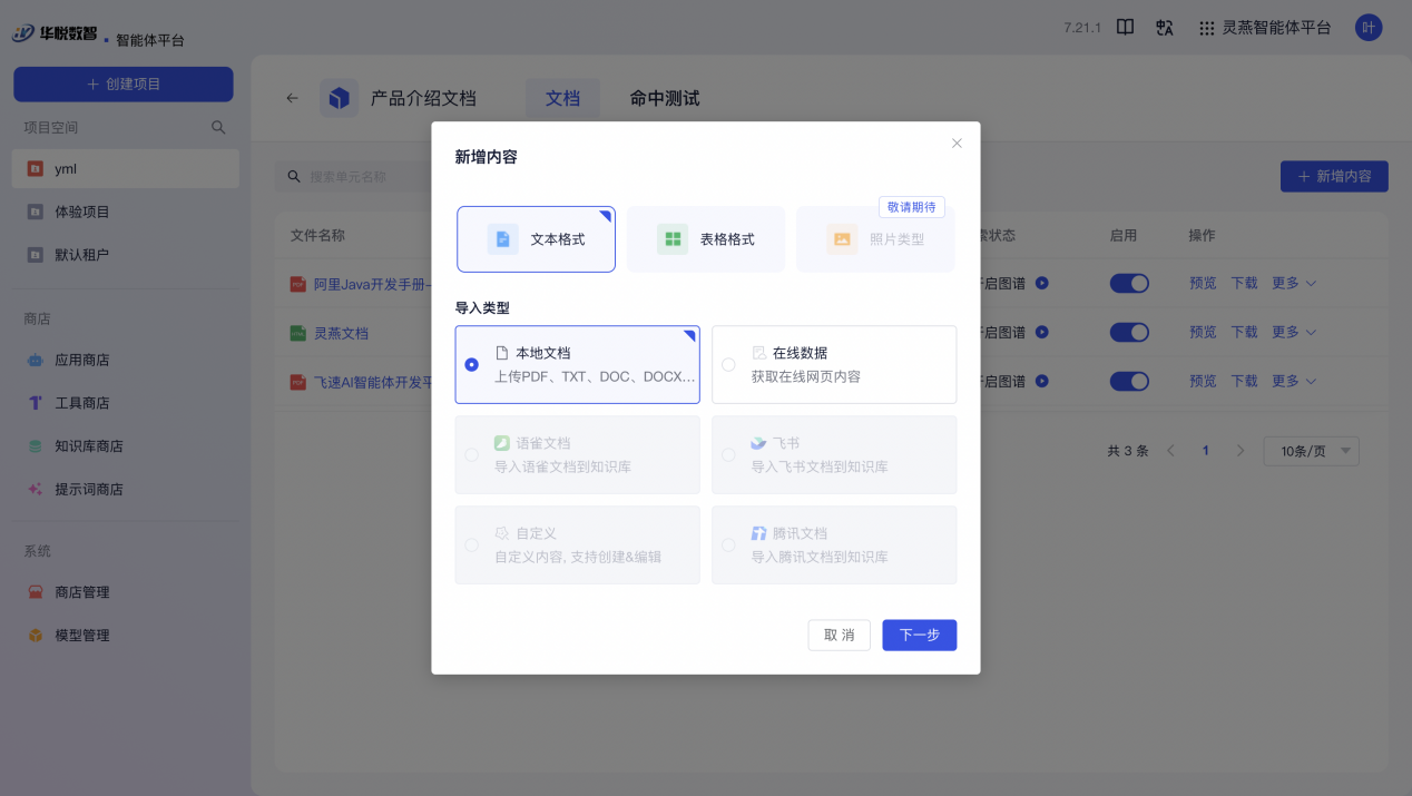 (4)知识库:知识库的作用是让模型获得并学习更多的专业知识,从而能够解决一些专业问题,企业可上传内部文件到知识库,借助知识库让大模型深度参与企业的业务;目前平台支持本地文档、网页链接、数据表等格式的知识库上传;
