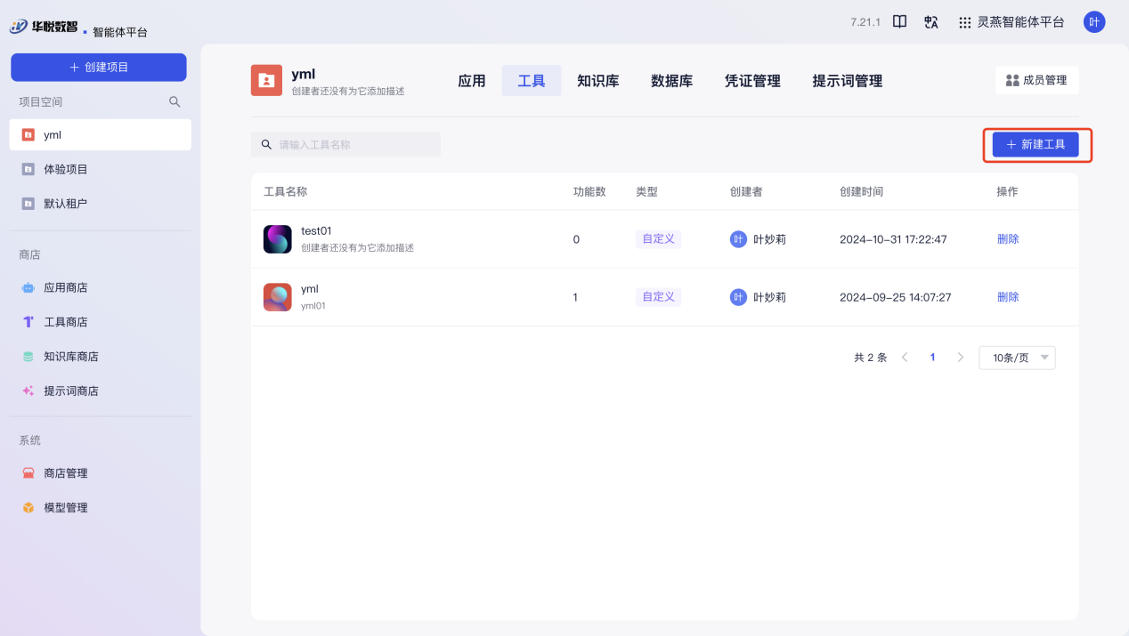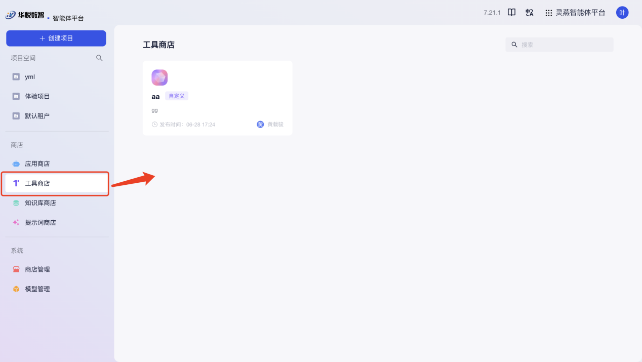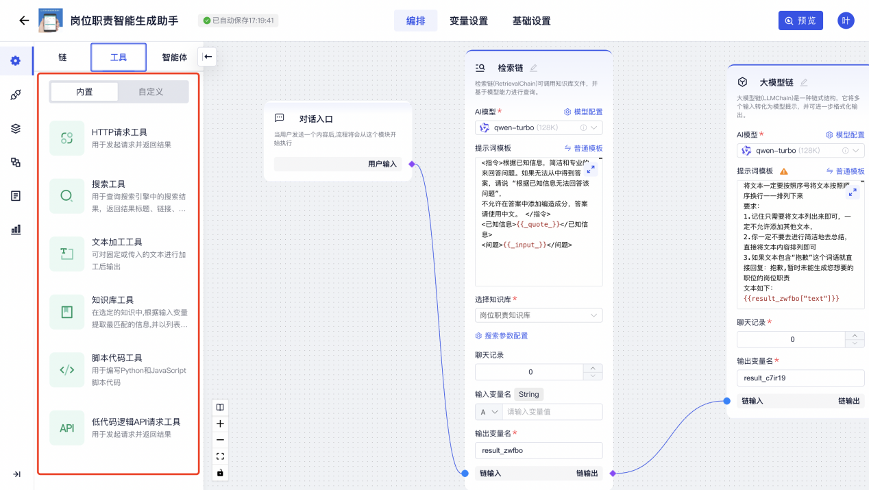工具来源:目前灵燕在零代码和编排中都内置了很多常用工具,零代码中包含23 个工具,编排中包含6 个工具;同时为提升的扩展性,灵燕支持用户自定义创建工具适用;并且增加了「工具商店」,用户可将创建的工具发布到工具商店,作为平台资产,实现快速复用。