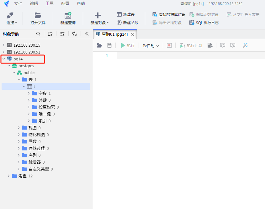 数据库对象:支持对 PostgreSQL 基础对象的可视化管理,包括数据库、模式、表、视图、物化视图、函数、存储过程、序列、触发器、自定义类型和角色;支持基于对象名称和对象 DDL 内容的搜索功能。