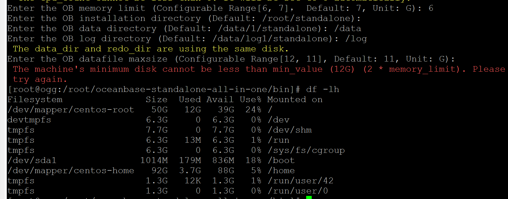 Enter the OB log disk size (Configurable Range[12, 23], Default: 16, Unit: G): 12