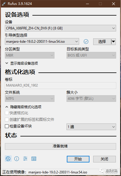 我这里是使用 Rufus 来制作系统的安装盘,整个过程很简单。首先去 Manjaro 官网下载镜像,选一个自己喜欢的发行版即可,我这里选的是 KDE 的版本。打开 Rufus 并且选择好引导类型即可,然后直接点开始等待即可,一切都按照默认配置来。