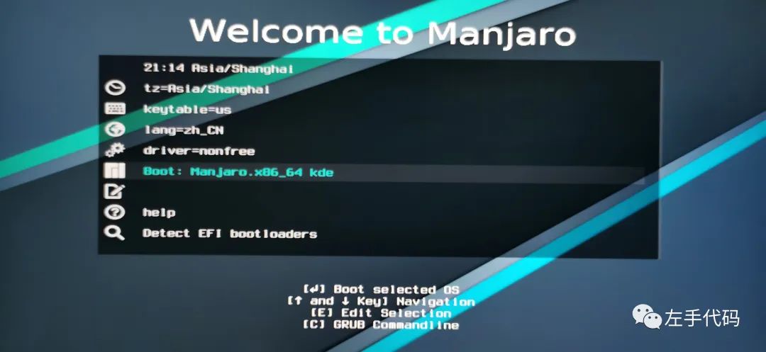 其中第一个 tz 是设置时区, 选择 Asia/Shanghai 即可; 第三个是语言, 选择 zh_CN; 第三个是显卡驱动, 有 free 和 nofree 两个选择, 分别是免费驱动和非免费驱动, 但是不管你怎么选择都是不用付费的. 自然就建议选择 nofree 了, 如果选择的是 free 的驱动, 那么默认会安装 nouveau 这个开源的 NVIDIA 显卡驱动程序, 好了只有选择 Boot 就会进入桌面启动安装程序了.