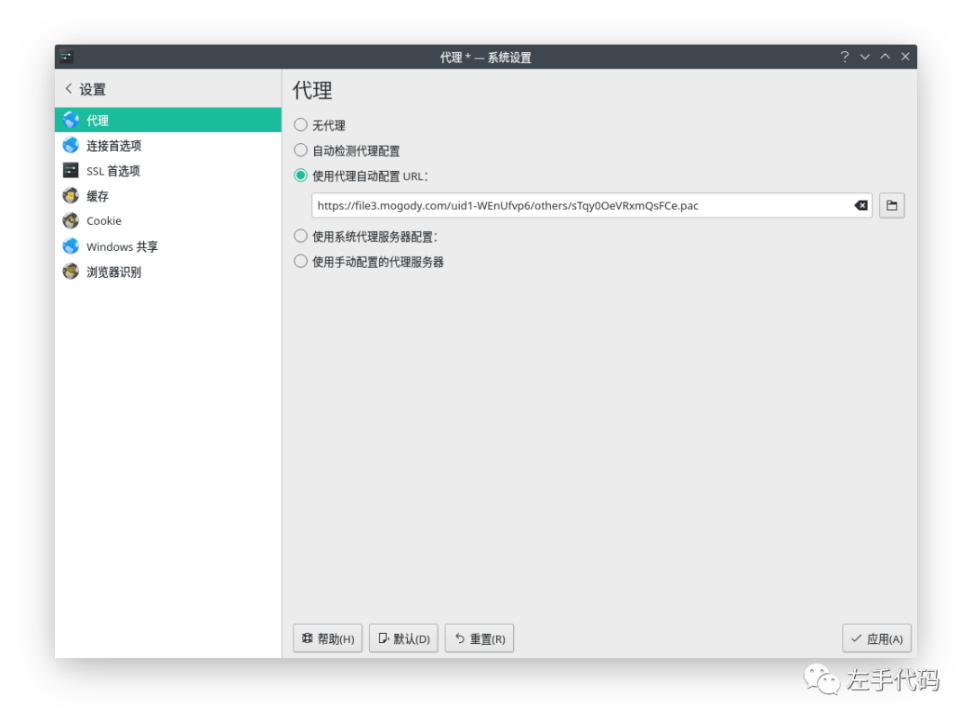 的文件,把该文件的路径填写到『系统设置-网络设置-代理-使用代理自动配置URL』中,不过大概率是不行的,因为现在不支持本地文件,必须是一个外链才可以: