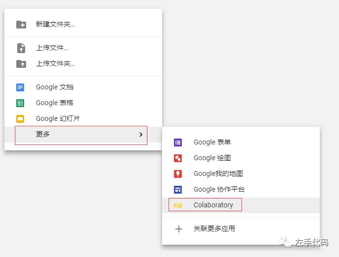 Colab 的所有服务都是用 Google Driver 来储存数据的,所以我们首先在 Google 的云端硬盘上新建一个文件夹,用来存储深度学习会用到的一系列文件,文件夹的名字随意。进入文件夹后右键新建一个 Colaboratory 支持的文件: