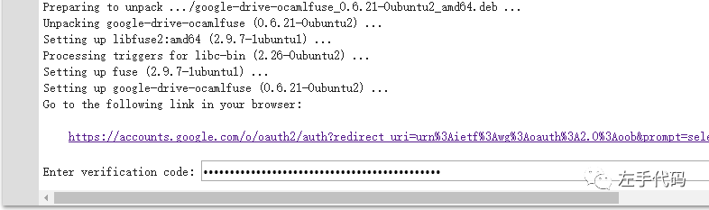 我们来用 MNIST 数据集训练一个简单的卷积神经网络,Colab 默认只能通过输入代码来运行,但是 Web 编辑有诸多不便之处,上文也说到了我们可以用 Google Driver 来储存文件,不过首先要执行一段授权代码 (代码太长,公众号后台发送 colab-auth 获取),然后会让你打开一个授权的 URL,打开之后把一串授权码复制粘贴进来即可,如图:
