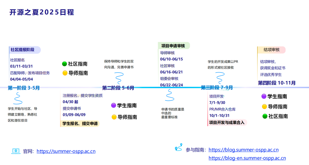 学生可自由选择项目,与社区导师沟通实现方案并撰写项目计划书。被选中的学生将在社区导师指导下,按计划完成工作,并将成果贡献给社区。社区评估学生的完成度,主办方根据评估结果发放资助金额给到学生。