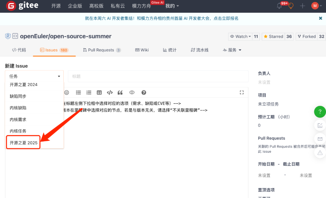 新建issue时选择类型“开源之夏2025”,会自动弹出模板