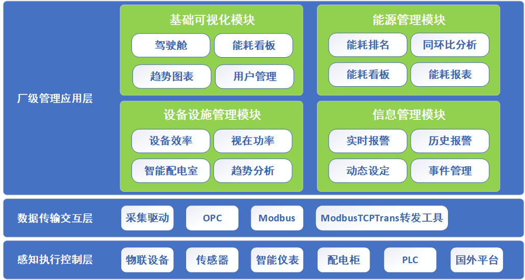 该平台拥有科学完善的建设方案,其系统架构涵盖多个层面。感知执行控制层作为物联网技术的基础,借助各类在线仪器仪表、生产设备和控制系统,收集基础数据;数据传输交互层通过强大的协议转换功能,在不影响生产运行的前提下,采集 PLC 和驱动器数据,并利用 ModbusTCPTrans 工具打破国外平台数据转发限制;厂级管理应用层则根据水厂各部门业务需求,开发出多种实用功能,助力建立能耗运营管理体系。
