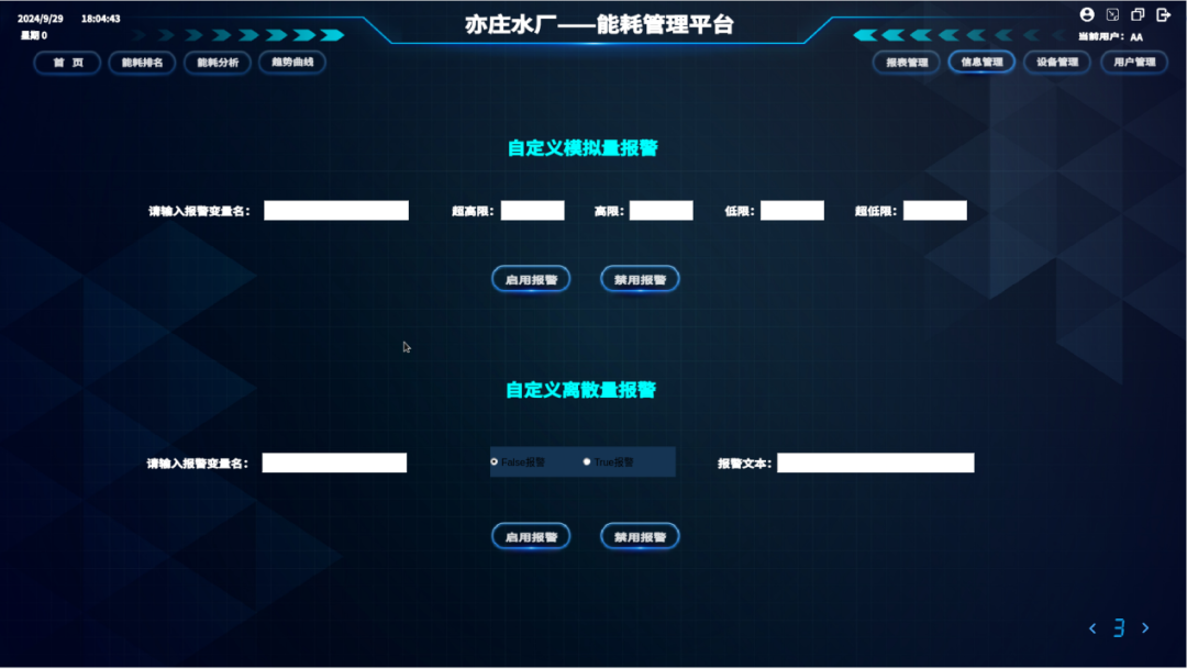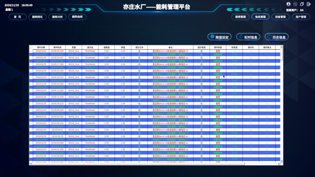 信息管理模块分为实时和历史报警两部分。实时报警窗展示当前报警信息,不同类型用不同颜色区分,方便操作人员及时发现问题。历史报警窗展示过往报警信息,支持筛选查询,便于追溯和分析。报警限值修改和自定义报警模块可灵活设置报警规则,满足用户不同需求。