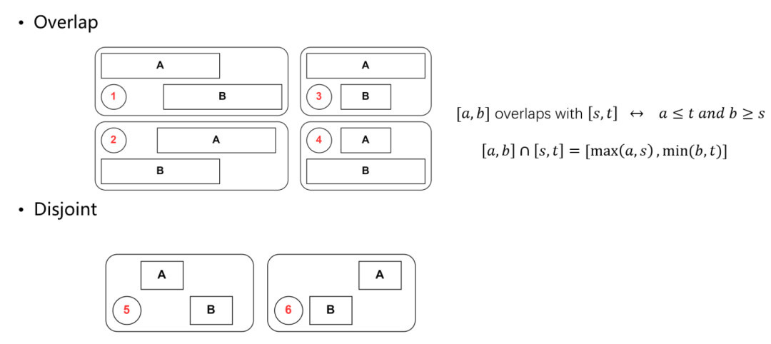 任给两个区间 和 ,它们要么相交(overlap, intersect),要么不相交(disjoint),如下图所示。其中 3 和 4 代表了一种特殊的相交关系——包含。很容易发现,两个区间相交的条件为 ,且交集为 。