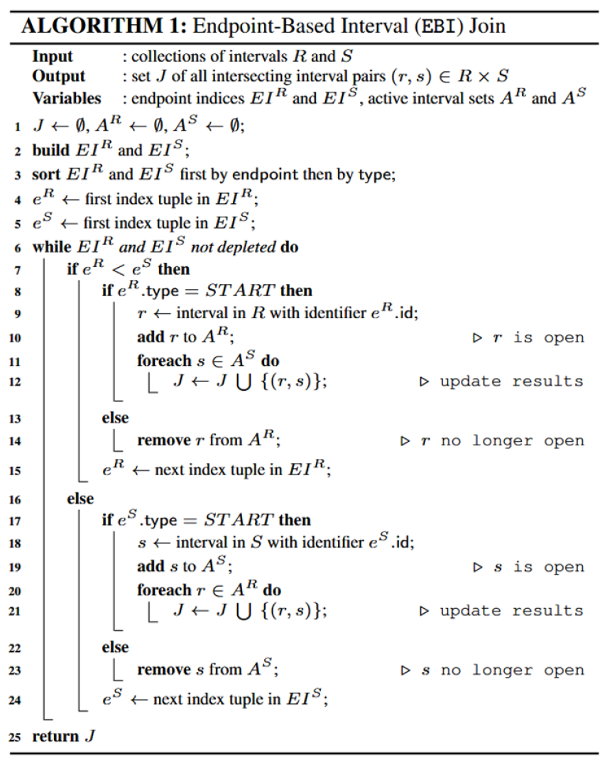 一个区间集合 也可被视作事件集合:,其中 endpoint 为每个区间的起点和终点,故共有 条事件。EBI 中将需要求交的两个区间集合 和 的事件集合按照 endpoint 和 type 排序。求交过程中,按照 endpoint 从小到大依次扫描事件,并维护当前 和 中已经开始、还没有结束的区间 和 (称为活跃集合)。每次扫描到一条 start 事件,就说明其与另一个集合中的活跃集合都有交集,将这些交集加入结果 中;若扫描到一条 end 事件,则从活跃集合中删去改区间。具体算法流程如下.