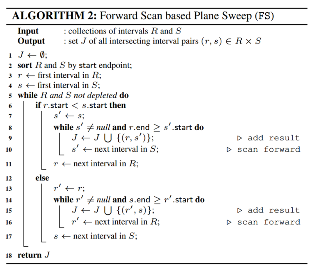 FS 方法直接处理区间,预处理时按照每个区间的起点进行排序。求交时,并不像 EBI 一样维护活跃集合,而是运行时通过对于另一个集合中的区间进行前向扫描,检查哪些区间可以与当前区间有交,并更新结果。具体算法如下所示。