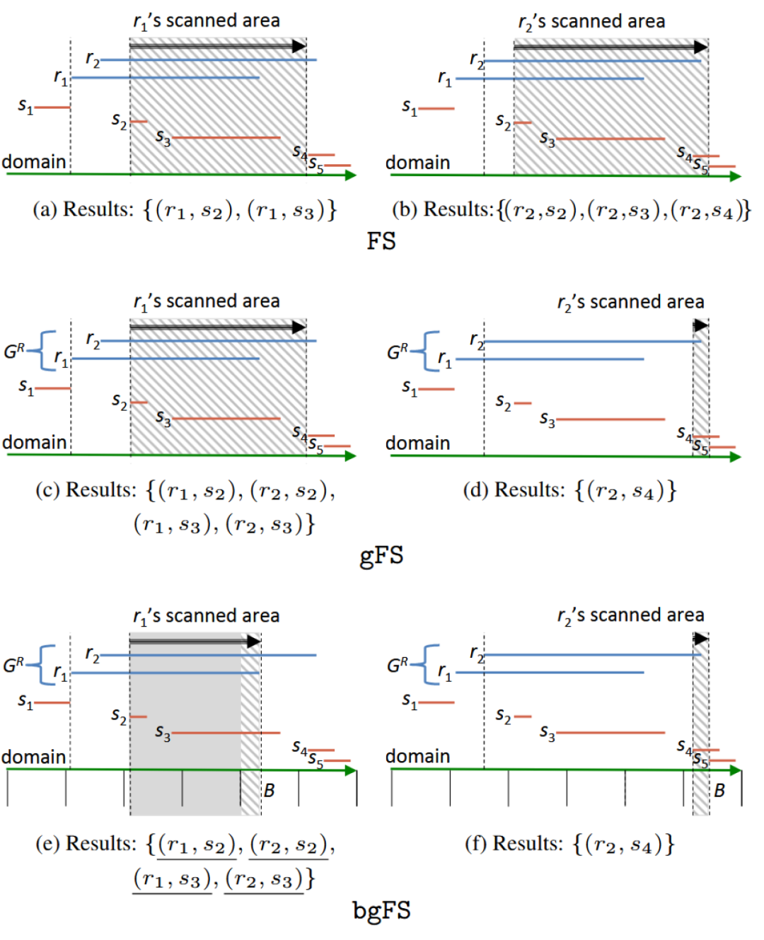 注意到 EBI 和 FS 分别需要做 和 次端点比较,如果能减少 FS 方法中产生结果过程中的比较次数 ,便会提高求交算法的性能。gbFS 中提出了两个针对 FS 的优化技巧,实现减少比较次数。