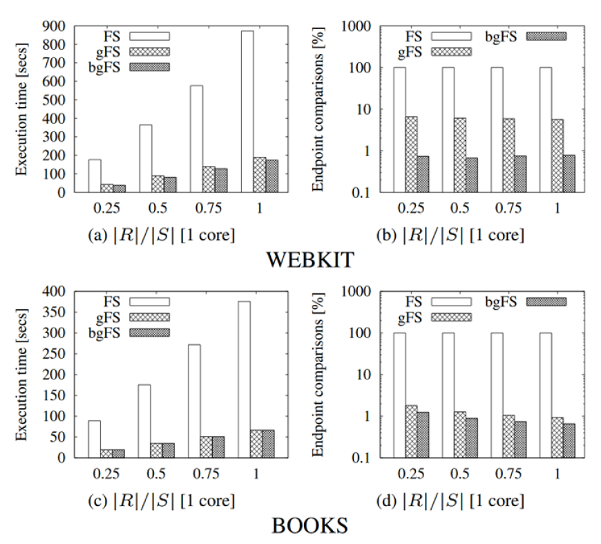 下图展示了在两个真实数据集上,FS、gFS 和 gbFS 区间集合求交的性能比较。可以发现运行速度确实随着比较次数的降低而加快。在 BOOKS 数据集上分组优化效果明显,这是因为该数据集中跨度大的区间数量多,因此一个分组内的区间数量较多,能充分利用分组。