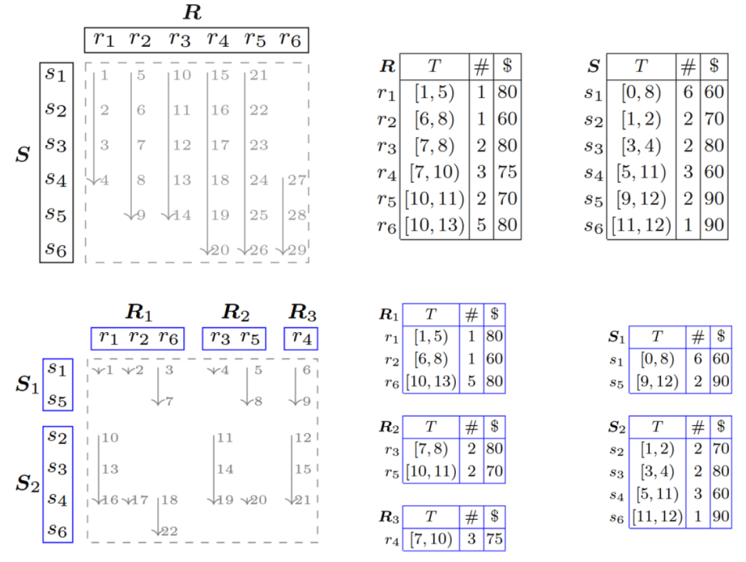 若采用类似关系型数据中的归并连接方法,不可避免需要做回溯(backtracking),带来过多的比较次数。若提前对区间集合进行划分,使得每个划分内,区间都是不交的,则可在求交中避免回溯,从有结果的最后一个区间开始,减少比较次数。如下图所示,通过对 和 划分,将比较次数从 29 减小到 21。