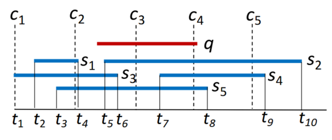 在很多应用场景下需要处理和管理区间数据(interval data)。一个区间由其起点 和终点 表示: (需要 )。例如在时序数据库(temporal database)中,每条记录(tuple)除了记录其原有信息,还额外存储了其有效期(valid time),其有效期就可以用一个区间的集合表示。再例如有时为了保护隐私,也可以用区间来代替具体的数值。下面的介绍中,统一采用时序数据库场景,每个区间代表了一条元组的有效期。