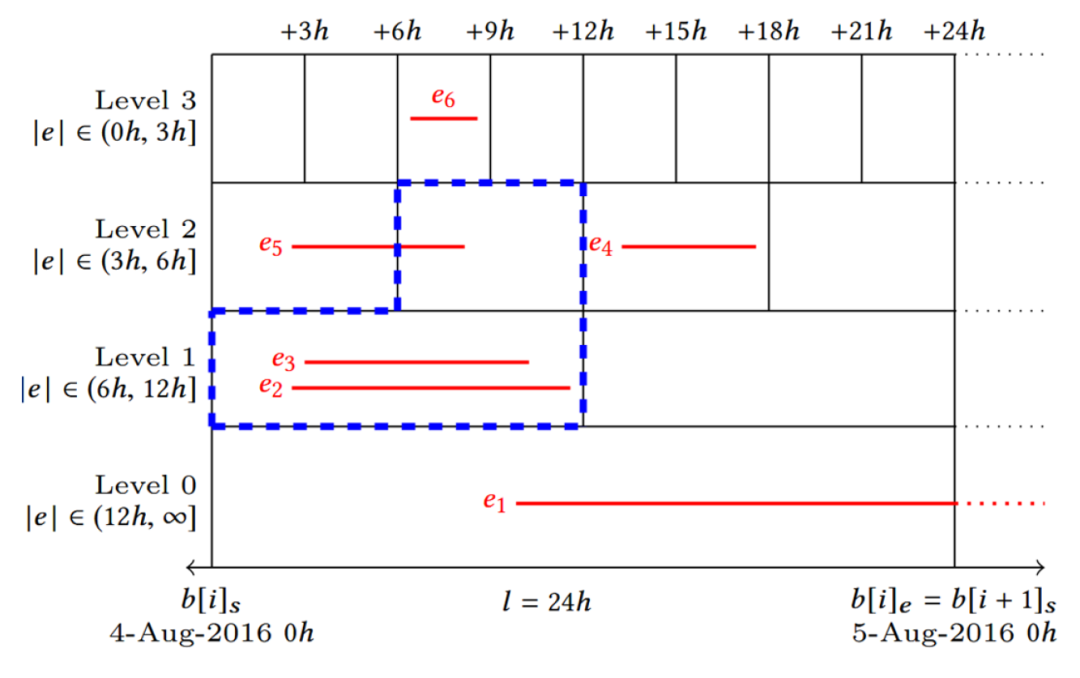 Period Index 被用在 Range duration 查询中,即需要返回在某个时间范围内,区间跨度也在一定范围内的区间数据。下图展示了 Period Index 的一个示例,不同层次(level)存储了区间跨度在不同范围内的区间,每个区间最多在同一个跨度的两个片段中出现。蓝色区域为对于查询:(1)时间范围为 ;(2)持续时间范围为 需要查找的片段。Period Index 也可以用于范围查询,只需查找对应时间范围内的片段即可。
