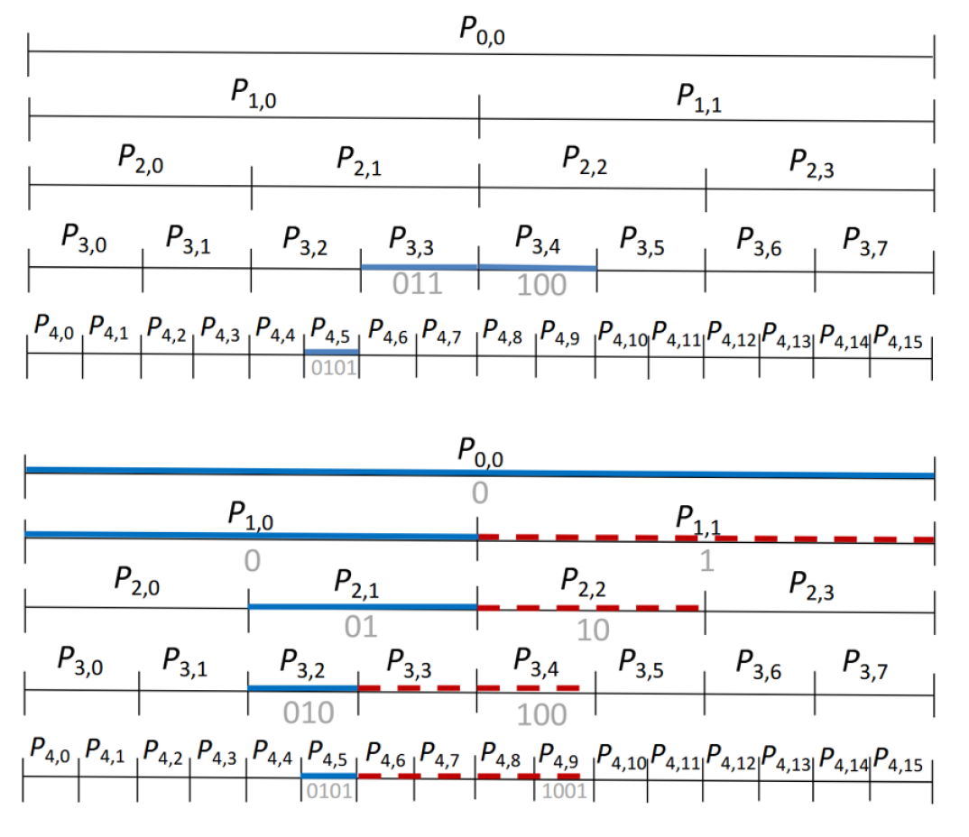 与前面方法不同,HINT为每个区域存储的区间为完全包含该区域的区间。如下图上部中,区间 将在蓝色线段对应的三个区域 , 和 中存储。查询时只需要从包含查询区间的区域内读取数据即可,无需进一步检查。如查找与 有交的区间数据,即可从下图下部的蓝色和红色线段对应的区域读取包含这些区域的区间。HINT 需要去重,去重可以通过对于每个区域数据进一步分为两部分:(1)起始于该区域;(2)在该区域之前起始。由此,每层的非首区域仅需读取从起始于该区域的区间即可。下图下部中,仅对于蓝色线段需要读取全部数据;而对于红色部分仅需读取起始于这些区域的区间。