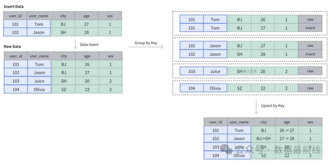 每行 Key 值唯一,确保给定的 Key 列不会存在重复行,基于主键进行 UPSERT 更新,Doris 存储层对每个 Key 只保留最新写入的数据。