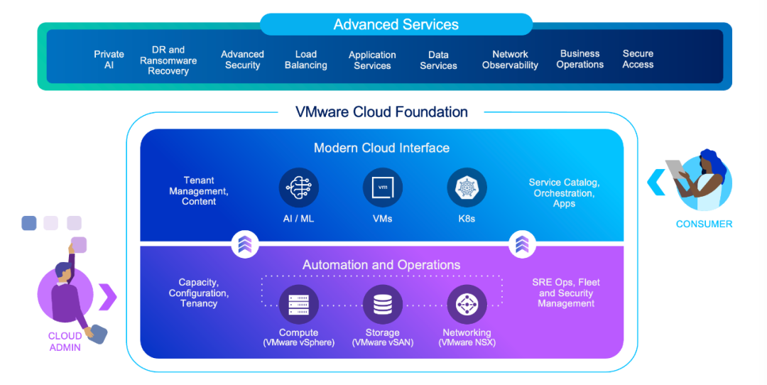 自动化部署:VCF 自动部署 vSphere、vSAN、NSX、VCF Automation 和 VCF Operations,减少部署时间和复杂性。
