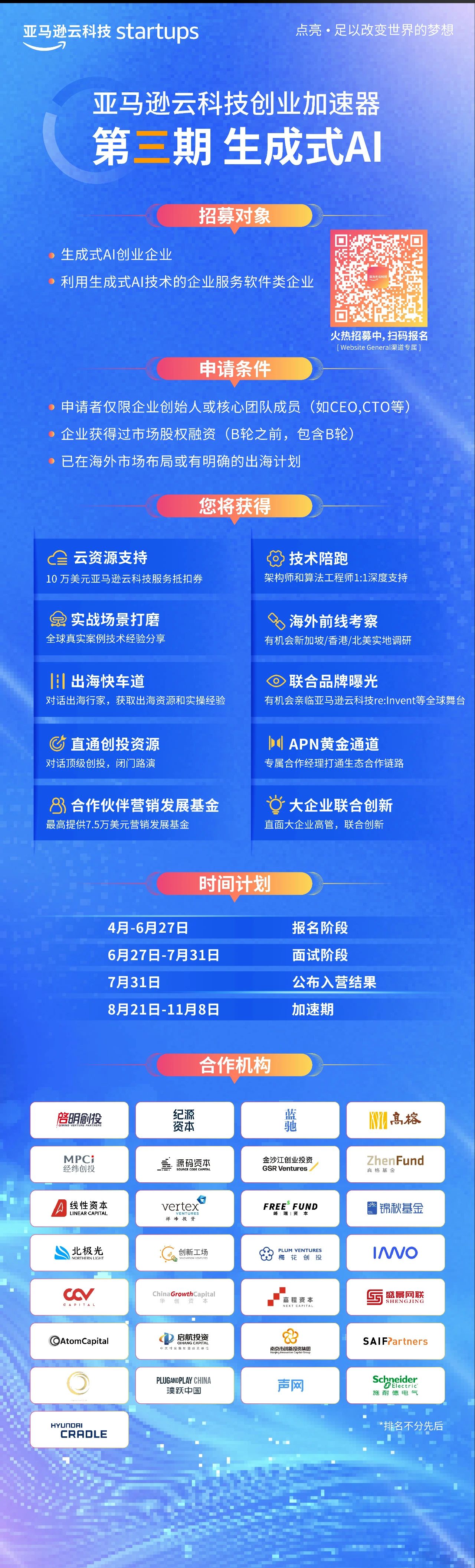 此外,亚马逊云科技团队还将帮助初创团队基于各自业务场景进行模型调优和产品优化,同时联合其合作伙伴网络成员,过往加速器初创企业及全球成功创业者,与本期初创企业分享他们的宝贵实战经验,提供可借鉴的真实案例与策略,助力其在全球找准定位。通过亚马逊云科技全球品牌营销资源,初创企业还将获得品牌营销支持及展示创新成果的机会,帮助其提升品牌知名度,吸引潜在客户,为其全球化发展奠定坚实基础。