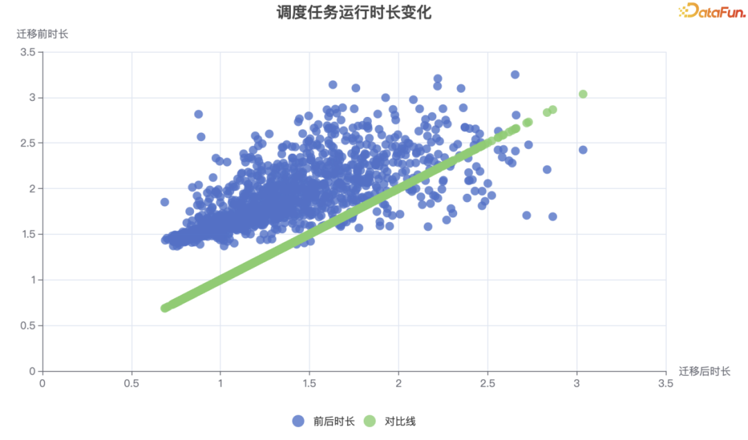 如上调度任务迁移前后运行时长变化对数散点图,我们观测到迁移期间一直存续的 1402 个 HSQL 任务中,其中 1333 个任务是变快了,性能提升在 35% 左右,另外 69 个任务由于迁移期间数据扫描量增多、或者迭代了 SQL 逻辑而变慢了。