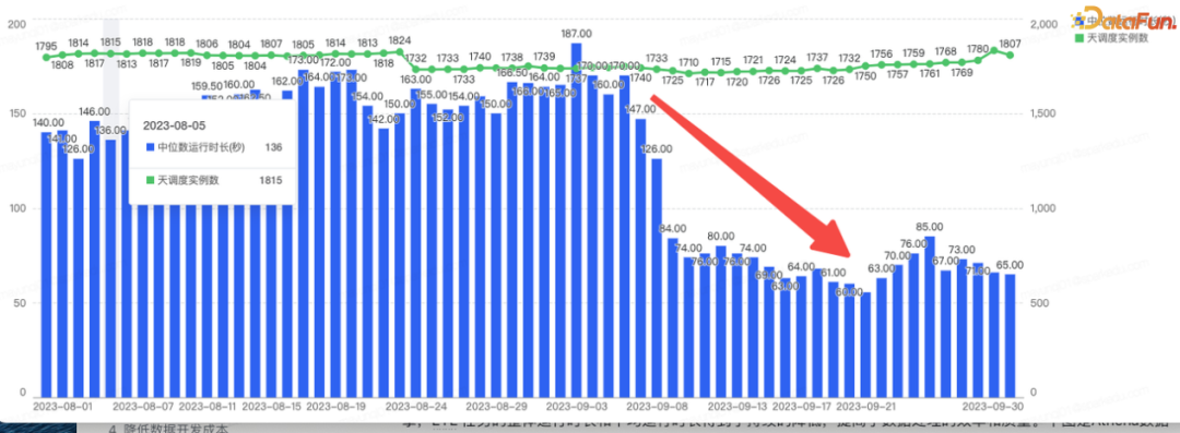 如上图所示,火花大数据在完成离线计算引擎切换后天调度整体运行时长缩减至原先的 2/3,天调度单任务运行时长中位数降低 56.57%。