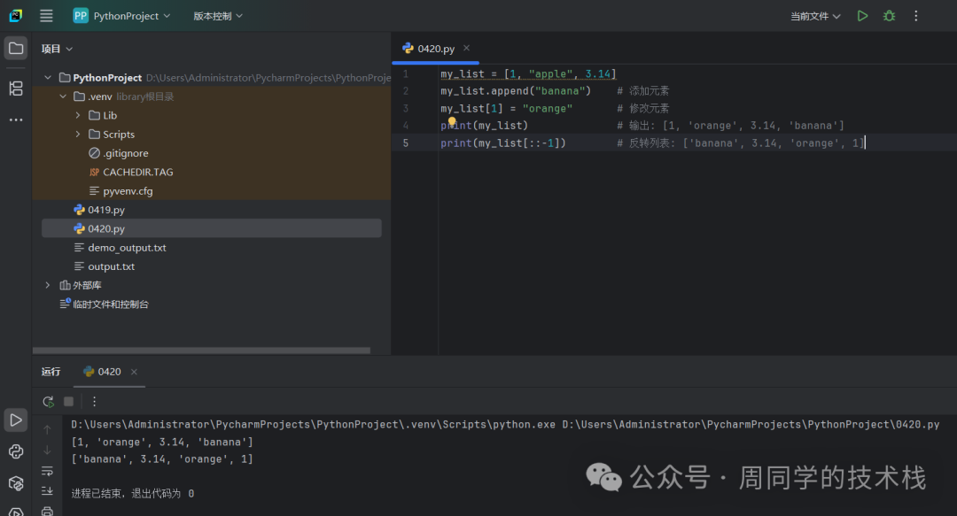 print(my_list[::-1]) # 反转列表: ['banana', 3.14, 'orange', 1]