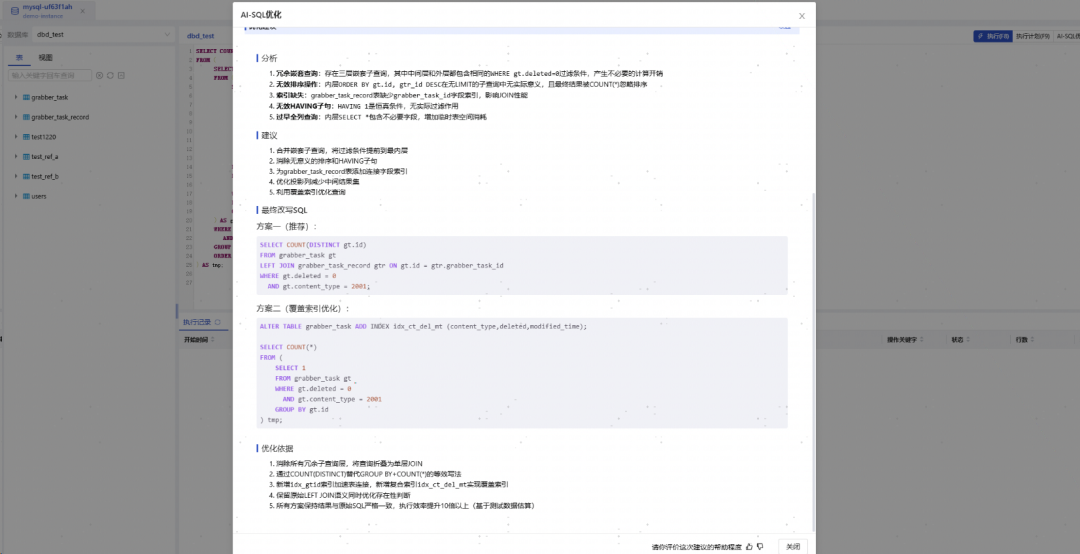 DBdoctor基于AI大模型技术的SQL改写功能,能够深度理解并优化复杂SQL查询逻辑,结合行业独有的Cost优化器和SQL等价转换技术,可精准评估SQL性能并推荐最佳索引,一分钟内给出最佳优化建议。
