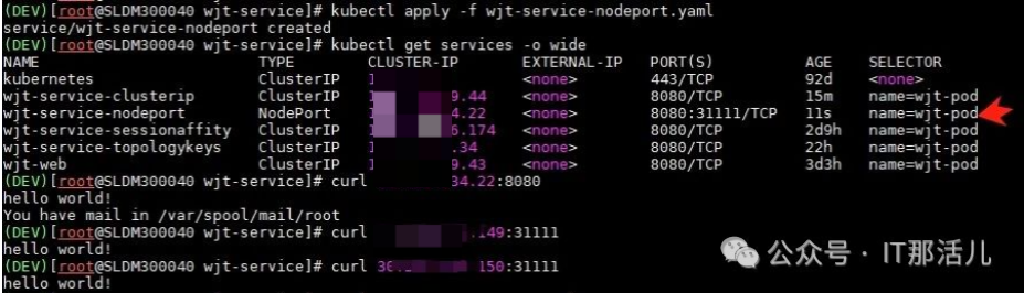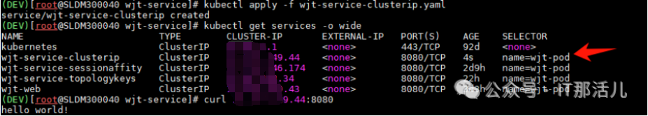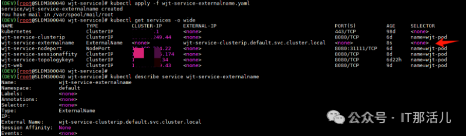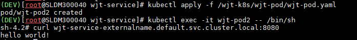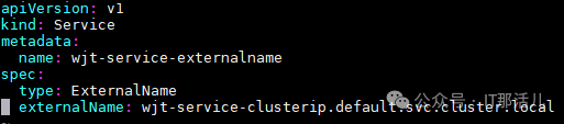 这里创建的 Service wjt-service-externalname,其 external name 指向另一个 Service wjt-service-clusterip 的域名,所以访问前者域名的时候相当于访问后者的服务: