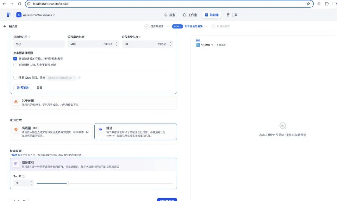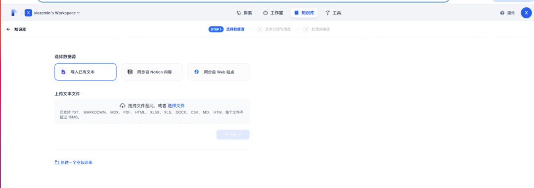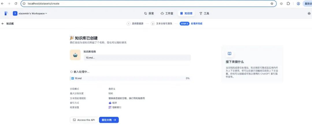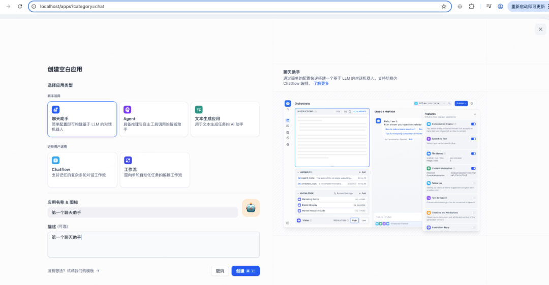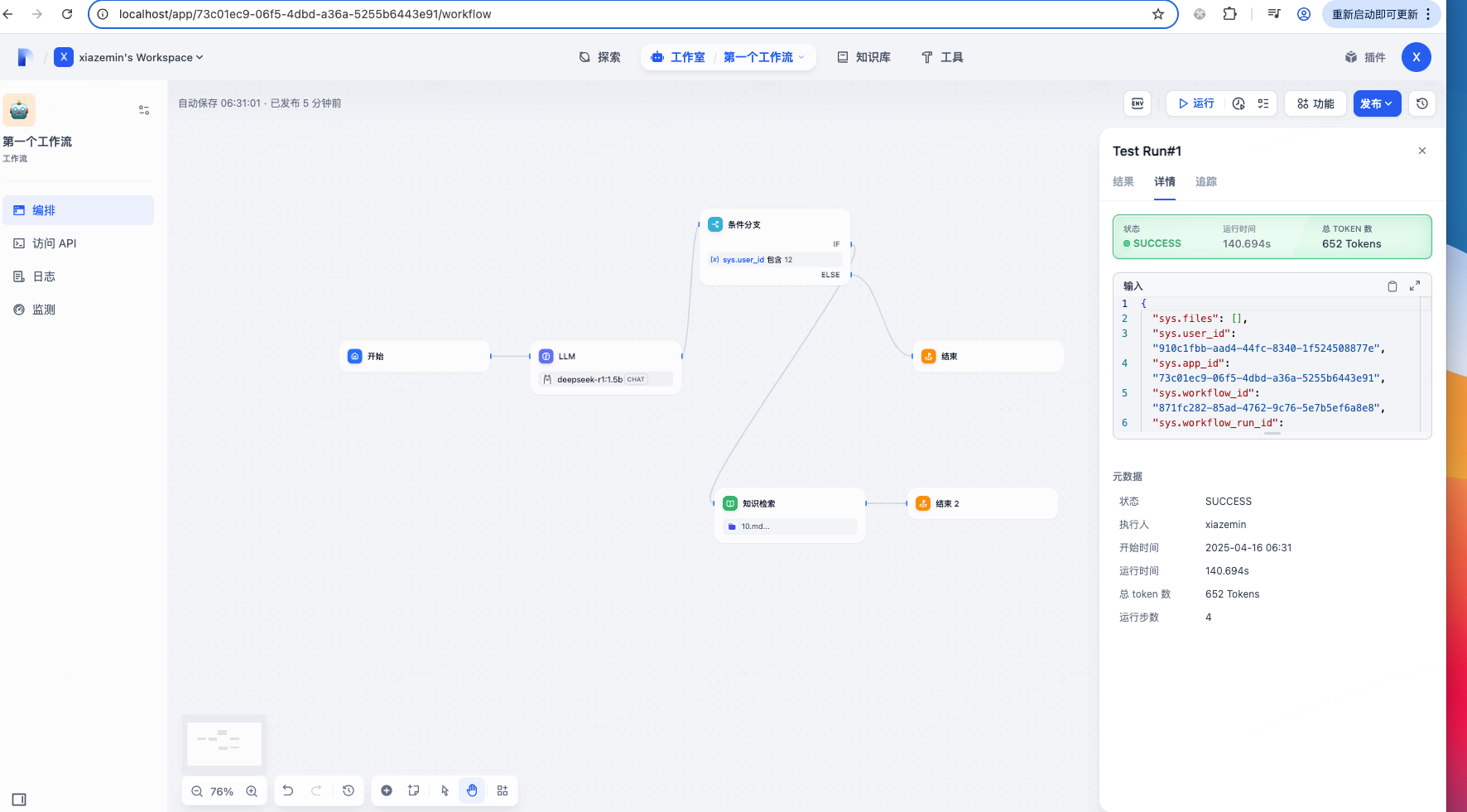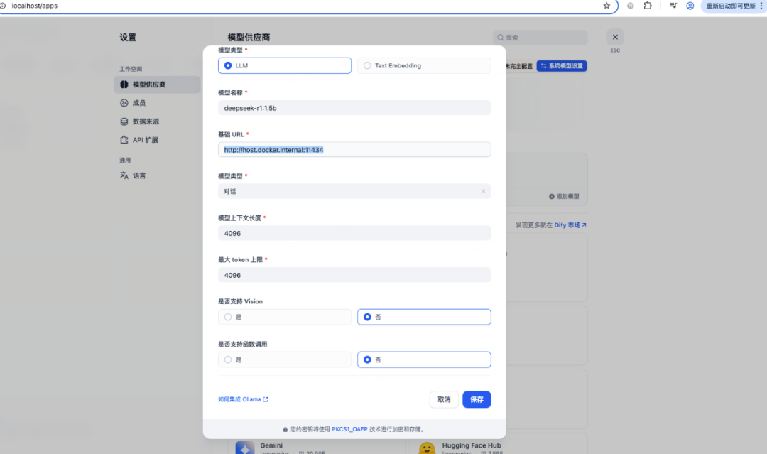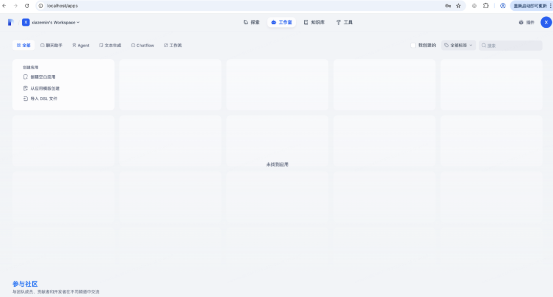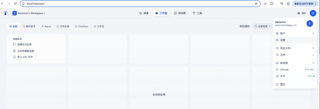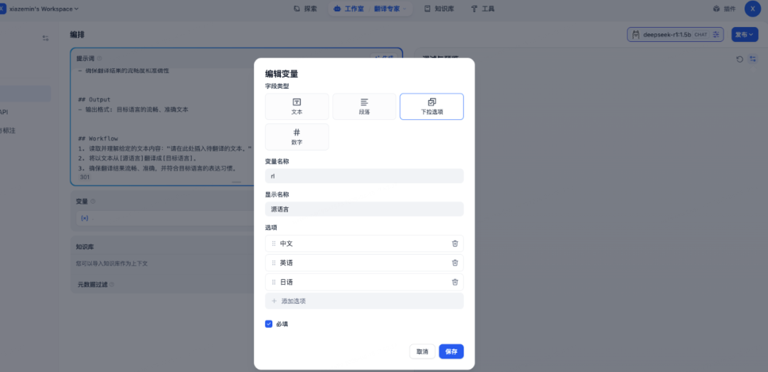 然后我们登录网页http://localhost/install设置用户名和密码登录进去就可以看到工作室,接着就可以在工作室里创建应用了有了知识库之后,我们需要介入大模型来实现聊天功能。点击右上角的头像,在下拉列表里选择设置:选择模型供应商,这里有目前市面上大量的模型供应商,为了使用deekseek,模型供应商选择ollama,使用之前需要安装ollama插件模型供应商插件安装好后,进入详细设置,这里模型名称就选deepseek-r1:1.5b, 基础URL选择http://host.docker.internal:11434测试完成后发布,点运行,就可以看到一个用户视角的应用至此一个机遇deepseek的rag聊天应用就发布完成了。 当然,如果除了聊天还需要执行一系列动作,可以创建agent应用,过程类似的。整体还是比较简单的,按照官方文档点击按钮就可以了。 比如我们要实现一个翻译专家,可以在左上角填写prompt模板,并且支持参数如果应用比较复杂,需要执行多个步骤,可以编辑工作流,通过线将多个流程连接成一个整体,具体如下:整体来说,dify使用起来是比较方便的,文档也比较完备,通过拖拽就可以完成我们的需求,搭建自己的ai应用。